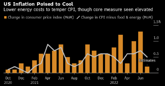 根据预测中值,7月份CPI同比涨幅可能从前一个月的9.1%降至8.7%。